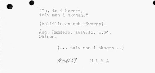 //// "Tu, tu i hornet, tolv man i skogen." //// (Va //// llflickan och rövarna). //// Ang. Ramsele, 1919:15, s.24. Ohlson. //// (... tolv man i skogen..*) /VcndlF? U L M A ////