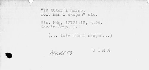 //// / //// "Tu tuter i horne, Tolv män i skogen" etc. //// I-ils. Hög , 12721:15 , s.24. Nordin-Grip, I. //// y, '<, * //// (... tolv man i skogen...) ^ u L M A ////