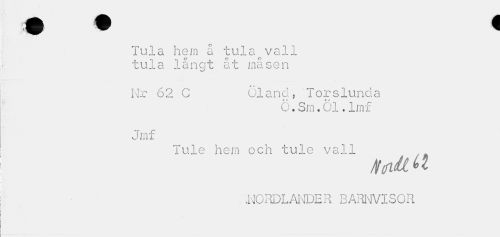 //// • t i //// Tula hem å tula vall //// tula långt åt måsen //// * * //// Nr 6 2 C 01 a n d , T or s lu nd a //// te * * //// O•Sm.01.lmf //// Jmf //// Tule hem och tule vall //// t mätt //// NORDLANDER BARNVISOR ////
