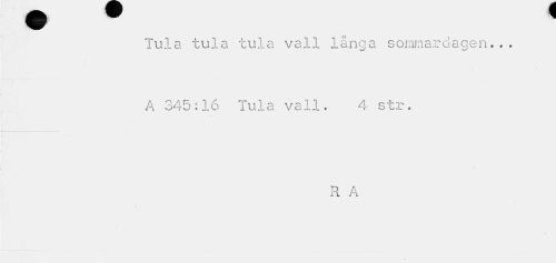 //// Tula tula tula vall långa sommardagen... A 345:16 Tula vall. 4 str. //// R A //// t ////