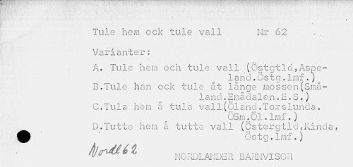 //// . . , • ¦ • • • . ¦>¦¦.¦ ' I ¦¦.'¦¦ • • I • > • . I . //// « //// 4 //// Tule hem ock tule vall Nr 62 ' . //// Varianter: //// A. Tule hem och tule vall (östgtld5Aspe- //// land.Östg.lmf•)o //// B.Tule han ock tule åt långe mossen(Små- //// land .Emådalen.E.S.) //// C.Tula hem å tula vall(Öland.Torslunda. //// OSm.Öl.Imf.) //// D.Tutte hem å tutte vall (Östergtld»Kinda, ^ östg.lmf.) //// /[imM é Kj NORDLANDER BARNVISOR ////