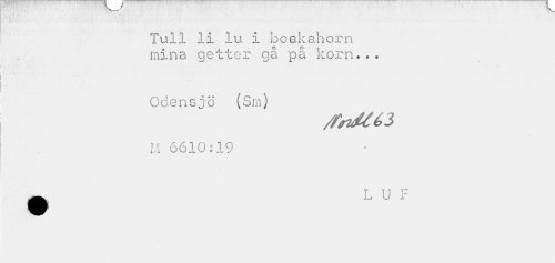 //// . — i //// Tull 11 lu 1 boekahorn mina getter gå på korn... //// Odensjö (Sm) //// /f<ndté3 //// M 6610:19 //// • LUF ////