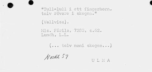 //// "Tul'1-lull I ett fingerhorn? tolv rövare i skogen." //// (Vallvisa). //// Hls. Färila, 7283, s.62. Lundh? L.L. //// (... tolv mani skogen...) //// * ////