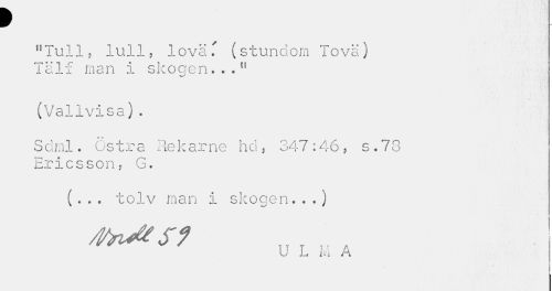 //// f //// "Tull <: luli , lova (stundom Tova.) Tälf man I skogen..." //// (Vallvisa). //// Scnl. östra Rekarne hd? 347:46, s.78 Ericsson? G. //// (... tolv man i skogen...) //// 4fri/t s? //// U L M A //// { [ ////