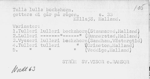 //// Tulla lulla bockahorn, 7 //// gettera di går på rågen, s. 33 //// Källsjö, Halland. //// Varianter: //// 1.Tu11e r i 1u11e r i bo c k ahorn(Stammare d,Ha11and) //// 2. Lu 11 e r i - ——---(Hunne r s t a d, Ha 11 a nd} //// 3.Vysseri lulleri beckahorn(Sandham,Västergtld) //// 4.Tulleri tulleri " ^Grimeton,Halland) //// 5. » f{ 11 (Veddige, Halland) //// STRÖM SV.VISOR o.RAMSQR //// /i/w^tt | //// i ////