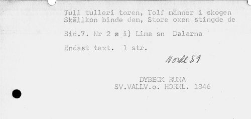 //// Tull tulleri tören, Tolf männer i skogen Skallkon binde dem, Store oxen stingde de //// Sid.7. Nr 2 a i) Lima sn Dalarna //// Endast text. 1 str. //// fl rutt- i7 //// DYBECK RUNA SV. VALL V. o. HORNL. 1846 ////