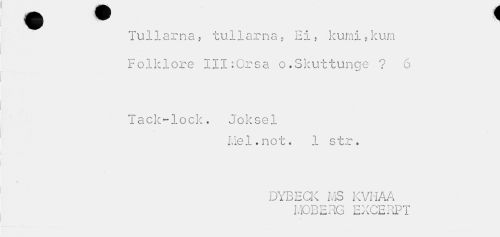 //// Tullarna, tullarna, Ei, kumi,kum Folklore III:Orsa o.Skuttunge ? 6 //// Tack-lock. Joksel //// Mel.not. 1 str. //// / //// DYBECK MS KVHAA MOBERG EXCERPT ////