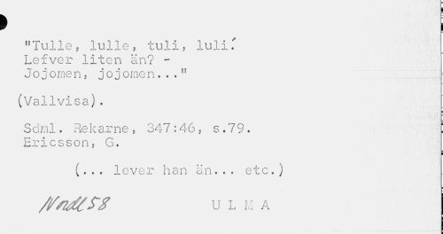 //// > I //// "Tulle, lulle, tuli, lulif Lefver liten än? -Jo jomen, j o j omen..." //// (Vallvisa). //// Sdml. Rek arne, 347:46, s.79. ! //// Ericsson, G. //// i //// (. . . lever han än... etc.) /frt&fS U L M A ////