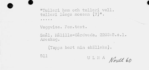 //// "Tulleri hem och tulleri vall, tulleri långa mossen (?)". //// Vaggvisa. Fon.text. //// Smal. Malilla-Gårdveda, 2203:8.s.1. //// \ //// Are skog. //// t //// (Tappa bort min skälleko). //// 511 u L M A fatt to ////