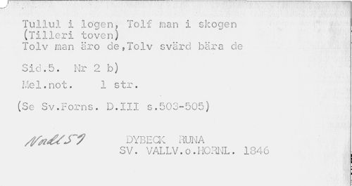 //// Tullul i logen, Tolf man I skogen (Tilleri toven) //// Tolv man äro de,Tolv svärd bära de //// Sid.5. Nr 2 b) Mel.not. 1 str. //// (Se Sv.Forns. D.III s.503-505) //// DYBECK RUNA SV. VALLV.o.HGRNL. 1846 ////