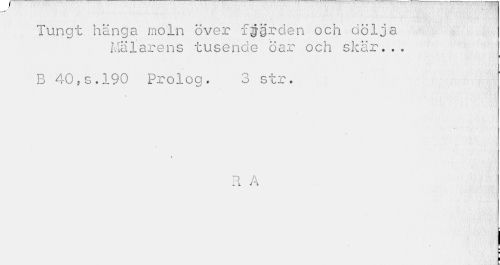 //// Tungt hänga moln över fjgrden och dölja //// Mälarens tusende öar och skär... //// B 40,s.190 Prolog. 3 str. //// i //// » //// D A //// IL //// i ¦ //// ¦ //// ! ////
