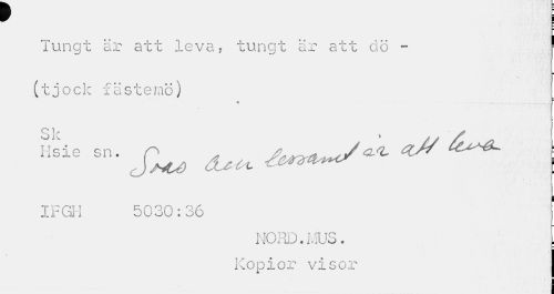 //// r i //// ¦ //// ¦ //// Tungt är att leva, tungt är att dö - ' //// ¦ //// (tjock fästemö) //// A //// IFGH 5030:36 //// NORD.MUS. . //// Kopior visor I ////