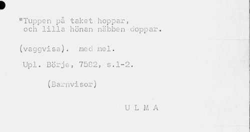 //// "Tuppen på taket hoppar, och lilla hönan näbben doppar. //// (vaggvisa)c med mel. //// N //// Upl. Börje, 7582, s.1-2. //// \ //// (Barnvisor) //// U L M A ////