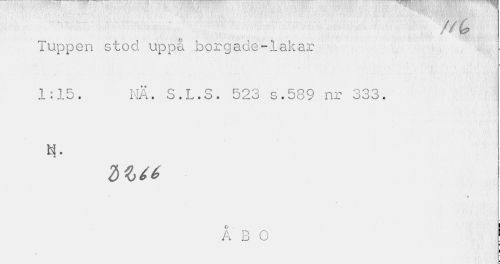 //// . . - • - • • - • . v ¦ 1 //// Tuppen stod uppå borgade-lakar 1:15. NÄ. S.L.S. 523 s.589 nr 333. //// N- //// i //// Å B 0 ! //// i //// I //// * //// ¦ ////