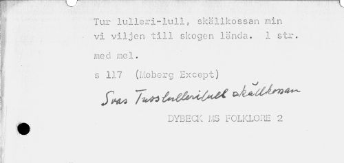 //// ' . • > -é ¦ //// Tur lulleri-lull, skällkossan min //// • vi viljen till skogen lända. 1 str. //// ¦ //// med mel. //// s 117 (Moberg Except) //// fw /L» //// I H I //// •DYBECK MS FOLKLORE 2 //// III- //// . . .1 ////