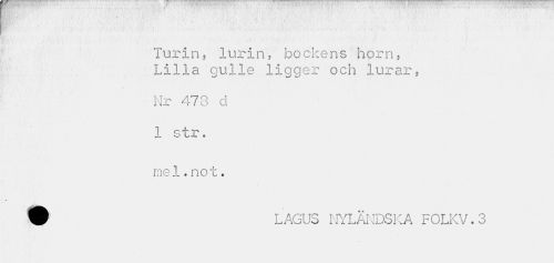//// • • . //// Turin, lurin, bockens horn, Lilla gulle ligger och lurar, //// Nr 478 c! //// 1 str. //// mel.not. //// W' LAGUS NYLANDSKA F0LKV.3 ////