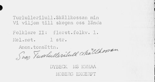 //// ? //// Turlullerilull.Skällkossan min Vi viljom till skogen oss lända //// Folklore II: flerst.folkv. 1. Mel.not. 1 str. //// c I //// Anon.tonsättn. . //// DYBECK MS KVHM MOBERG EXCERPT //// i ////