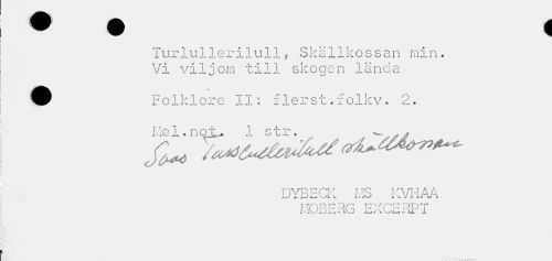 //// Turlullerilull? Skällkossan min. Vi viljom till skogen lända //// Folklore II: £lerst.folkv. 2. //// Me 1. noi> 1 str. ^ ^ //// DYBECK KS KVHAA MOBERG EXCERPT ////
