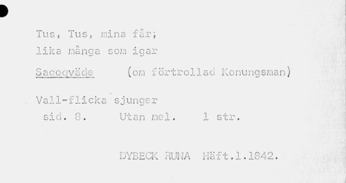 //// p //// Tus, Tus 5 mina f år; lika många som igår //// Saqoqväde (om förtrollad Konungsman) //// . Vall-flicka sjunger //// sid. 8. Utan mel. 1 str. //// DYBECK RUNA Haft.1.1842. //// t //// <jn ////
