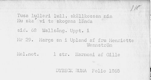//// • r 1 ' " • -v • * *. «i ; * ¦ • r\ . , , '"' i A \ V ¦ 4- i" ^ . ' f','v • \ ; :< . H »i , 1,1/i ;vr .. *, v." »* * • > • • •• //// Tusa lulleri lull, skällkossan min Nu ska'' vi te skogena lända //// sid. 68 VJallsång. Uppt. i //// i //// Nr 29. Hargs sn i Upland af fru Henriette //// Wennström //// Mel.not. 1 str. Harmoni af Gille //// * ti v « //// DYBECK TiUNA Folio 1C65 \ //// 1 ////