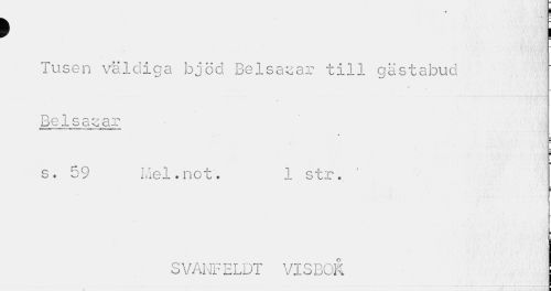 //// > //// Tusen väldiga bjöd Bel-saear till gästabud Be ls as-ar //// tme-M..1' • .-¦trai>,iTi»iT-^.-aMu.y .1 rn »Il — c.-^ //// s. 59 Mel.not. 1 str. //// ¦ //// SVANFELDT VISBOK j ////