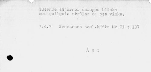 //// Tusende sjjjärnor däruppe blinka //// med gullgula strålar de oss vinka, //// ... : , i : , ' //// 7:4.? Svenssons saml.häfte Nr 31.s.187 //// » >¦ //// ÅBO ////