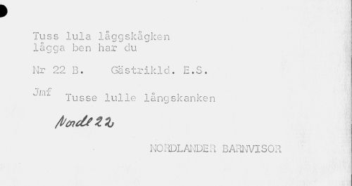 //// f //// Tuss lula låggskågken lågga ben har ciu //// Nr 22 B. Gästrikld. E.S. //// *T v- C //// Tusse lulie långskanken //// NORDLANDER BARNVISOR ////