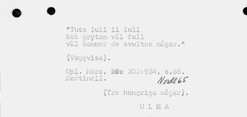 //// ,fTuss luli li luli //// kok grytan väl full //// väl kommer de svultna mågar.n //// (Vaggvisa). //// Upl. Nora, 20 ö 303:934, s.66. Mar t i ne 11. //// (Tre hungriga mågar). //// U L M A //// 4 ////