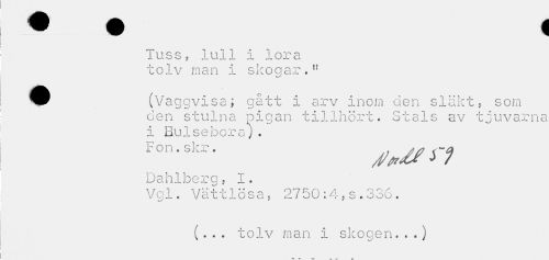 //// Tuss, lull I lora tolv man i skogar." //// ^P (Vaggvisa; gått i arv inom den släkt, som //// den stulna pigan tillhört. Stals av tjuvarna i Bulseboraj. //// skr. »^r; //// Dahlberg, I. //// Vgl. Vättlösa, 2750:4,s.336. //// (... tolv man i skogen...} //// vt -t* *t t> r, ////