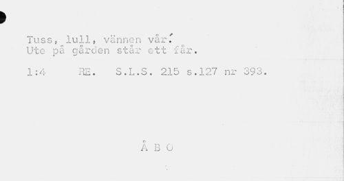 //// > //// Tuss, lull, vännen vår. Ute på gården står ett får. //// 1:4 RE. S.L.S. 215 s.127 nr 393. //// Å B O //// » • //// * //// ¦ ////