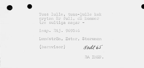 //// Tuss lulle, tuss-lulle kok grytan är full, då kommer tre sultiga magar - //// insp. Rt j . 9695:6 Lundström, Ester, Storuman (barnvisor) /Yfodt //// RA INSP. ////