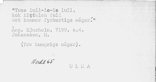 //// V v ' » y. . gtf'jrjfÄjr.f //// "Tuss lull-le-le luli, //// kok kidjfelen full //// det kommer fyrhurtiga magar.'" //// o //// Ang. Bjurholm, 7199, s.4. Johansson» H. //// (Tre hungriga mågar). //// /Vwuéy //// U L M A ////