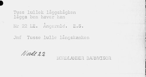 //// r //// Tuss lullek låggskågken //// o //// lägga ben haver han //// c //// Nr 22 LE. Angermld. E.S. Jmf Tusse lulle långskanken //// NORDLANDER BARNVISOR ////