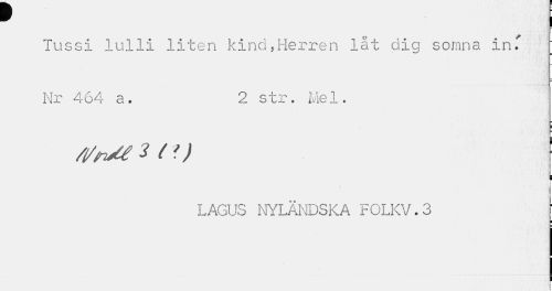 //// r ! //// Tussi lulli liten kind,Herren lat dig somna in. ; //// Nr 464 a. 2 str. Mel. //// ¦ //// i | //// ////1/é 3 (?) //// ¦ I //// t i LAGUS NYLÄNDSKA FOLKV.3 //// I ¦ //// < ////