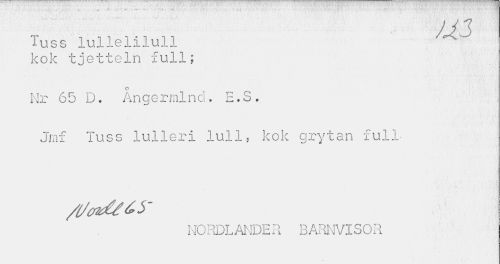 //// Tuss lullelilull * m ; //// kok tjetteln full; //// o //// Nr 65 D. Angermlnd. E.S. Jrnf Tuss lulleri lull, kok grytan full- //// NORDLANDER BARNVISOR ////