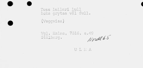 //// w w f //// Tuss lulleri luli koka grytan väl full. //// a (Vaggvisa) //// Vgl. Hal na, 7316,' s.49 //// Stålberg. /l/fiztft^ //// U L il A ////