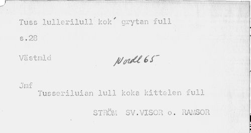 //// Tuss lullerilull kok' grytan full //// i //// s. 28 //// Västmld //// Jraf //// Tusseriluian lull koka kittelen full //// ST'...SV.VISOR o. RAMSOR ^ ////