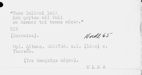 //// p //// "Tuss lulleri luli Kok grytan väl full De kommer tri tomma magar." //// 51 Q //// (Barnvisa) . /t/*i& ~ //// Upl. Altuna, 303:734, s.l. (16:o) a. ! //// Thorsen. //// (Tre hungriga mågar). //// U L M A //// ' - ——« 7 ---:--*—*-¦¦• : ---|V,. , f^j-,,j ////