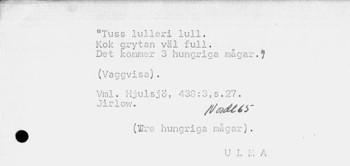 //// - . ¦ _ * - ' j //// * "... . //// . HTuss lulleri lull. //// Kok grytan väl full. //// Det kommer 3 hungriga magar. *) //// (Vaggvisa). //// Vml. Hjulsjö, 438:3,s.27. //// Jirlow- /i/^éy //// •(Wre hungriga magar). //// u l l: a ////