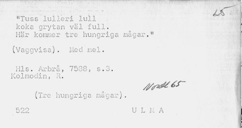 //// ' I Jjf //// "Tuss lulleri lull //// koka grytan väl full. //// Här kommer tre hungriga magar.n //// (Vaggvisa). Med mel. //// Hls. Arbrå ? 7538, s.3. Kolmodin, R. //// (Tre hungriga mågar). //// . //// 522 U L M A I ////