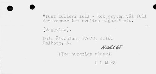 //// • * 1 //// "Tuss lulleri luli - kok grytan väl full det kommer tre svultna magar." etc. //// (Vaggvisa). //// Dal. Älvdalen, 17672, s.161 Dalborg, A. //// (Tre hungriga magar). //// U L M AS ////