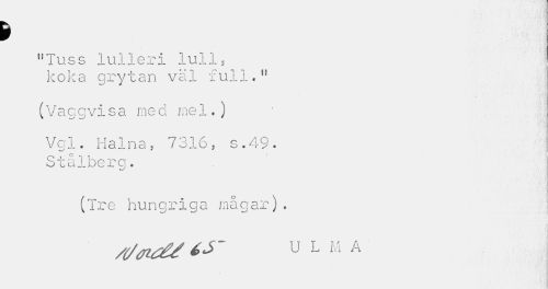 //// ^ '' I //// nTuss lulleri luli, koka grytan väl full." //// u //// (Vaggvisa med mel.) //// Vgl. Halna, 7316, s.49. Stålberg. //// B" //// (Tre hungriga mågar). //// A/oU&t*' ULM A ////