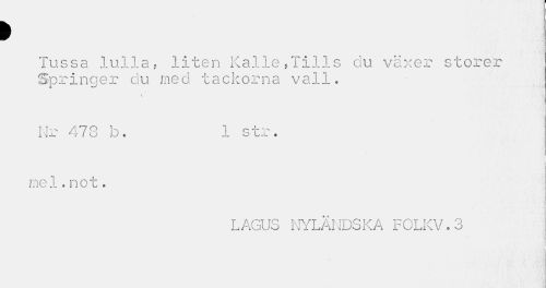 //// > //// Tussa lulla, liten Kalle,Tills du växer storer //// Springer du med tackorna vall. //// \ //// Nr 478 b. 1 str. //// mel.not. //// LAGUS NYLÄNDSKA FOLKV.3 //// * ////