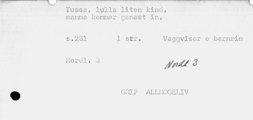 //// Tussa, lulla liten kind, mamma kommer genast in, //// s.231 1 str. Vaggvisor o barnrim //// Hordl- 3 /j/md/ 3 //// A GRIP ALLMOGELIV ////
