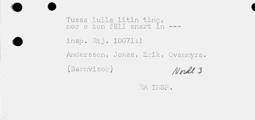 //// w v f //// Tussa lulla litin ting, mor o kom föll snart in--- //// insp. Rtj. 10071:1 //// Anderssons Jonas, Erik, Ovanmyra. //// (Barnvisor) /i/rM 3 //// RA IMSP. //// » H ////