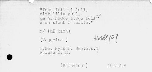 //// > //// "Tuss lulleri lull, mitt lille gull, om ja hadde stuga €ull'v' å en slank i farsta." //// x/ (mä barn) //// (Vaggvisa.) //// nmt '0 7 //// Nr ke , Ny sund 885 :6 , s . 4» //// Fors lund, 11. //// • » i //// ) //// (Barnvisor) U L M A ////