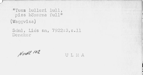 //// Hiuss lulleri lull, piss boxerna full" //// (Waggvisa) //// Sdml, Lids sn, 7922:3,s.11 Dencker //// * i //// /t/m/tf u L M A //// | ¦ ////