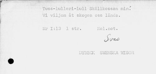 //// • • • //// ••¦:..•¦.'. i' ;k ' //// Tuss-lulleri-lull Skällkossan min T //// Vi viljom åt skogen oss lända. Nr 1:13 1 str. Mel.not. //// c //// DYBECK SVENSKA WISOR ////