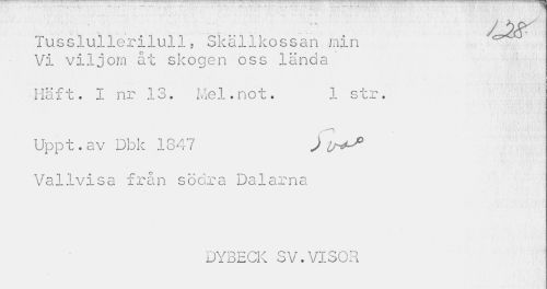 //// Tusslullerilull, Skällkossan min //// Vi viljorn åt skogen oss lända //// •' * p //// •Haft, I nr 13. Mel.not. 1 str. //// Uppt. av Dblc 1847 ) t^-^ //// Vallvisa från södra Dalarna //// DYBECK SV.VISOR ////