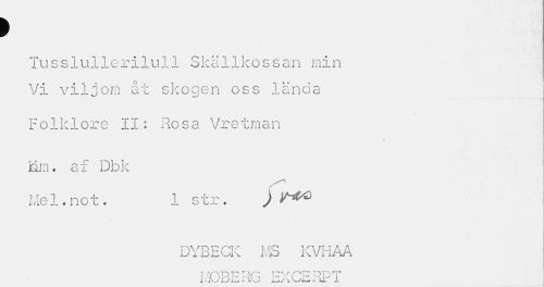//// > //// Tusslullerilull Skällkossan min Vi viljom åt skogen oss lända //// Folklore II: Rosa Vretman I //// ? //// Km. af Dbk //// Mel.not. 1 str. ) V^ //// DYBECK MS KVHAA //// laUBtiiU b/YOLiiLJl ////